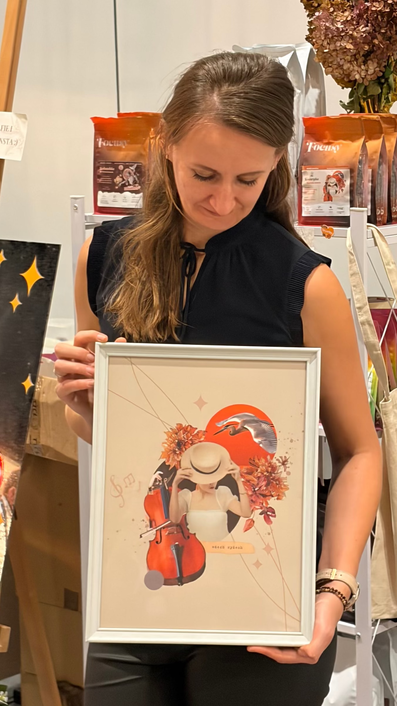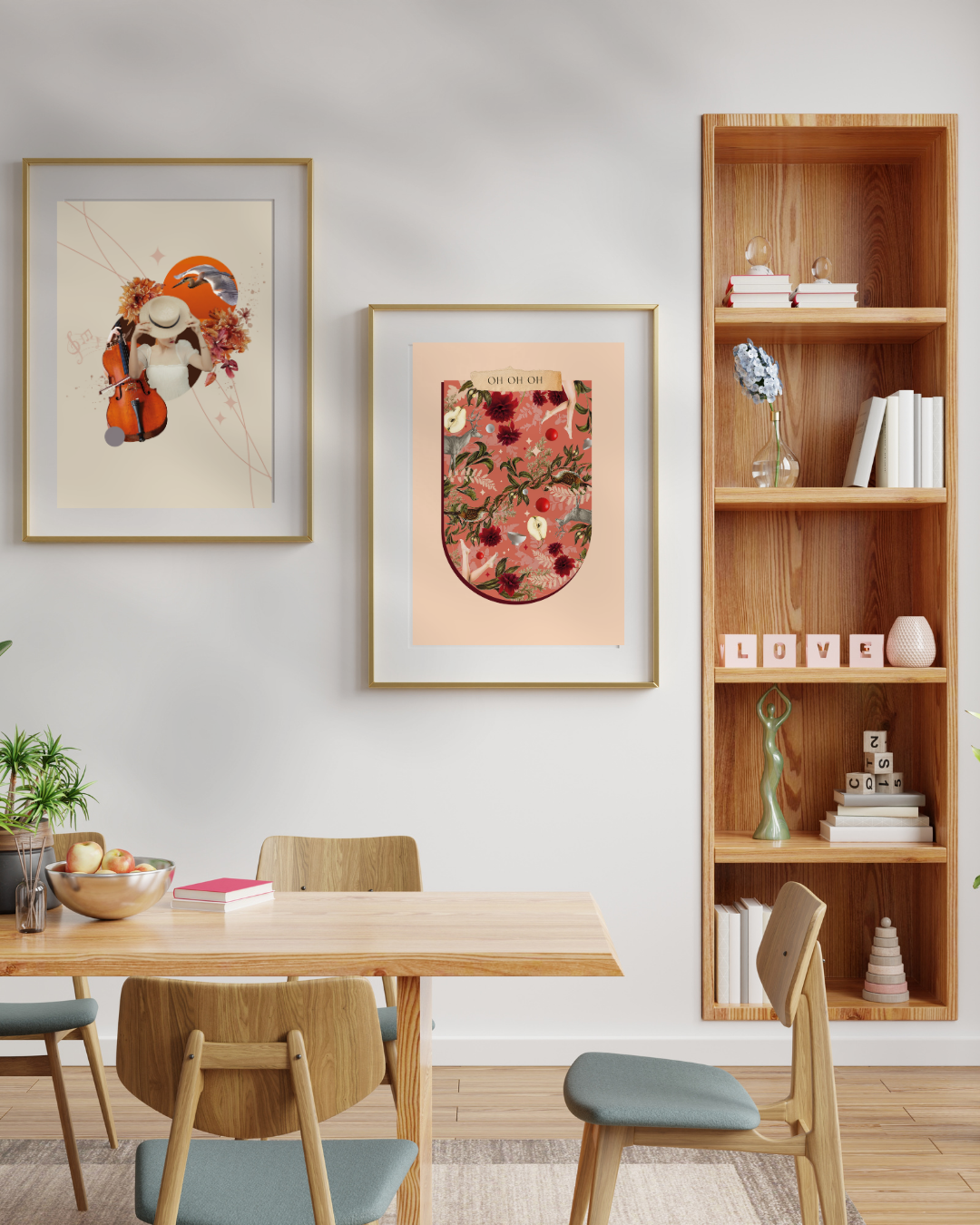Kolaże w rozmiarze A4 oraz 40x30 drukuję na grubym satynowym papierze o gramaturze 180 g który jest miły w dotyku i nie odbija światła. Stosuję druk pigmentowy, który idealnie odwzorowuje kolory.